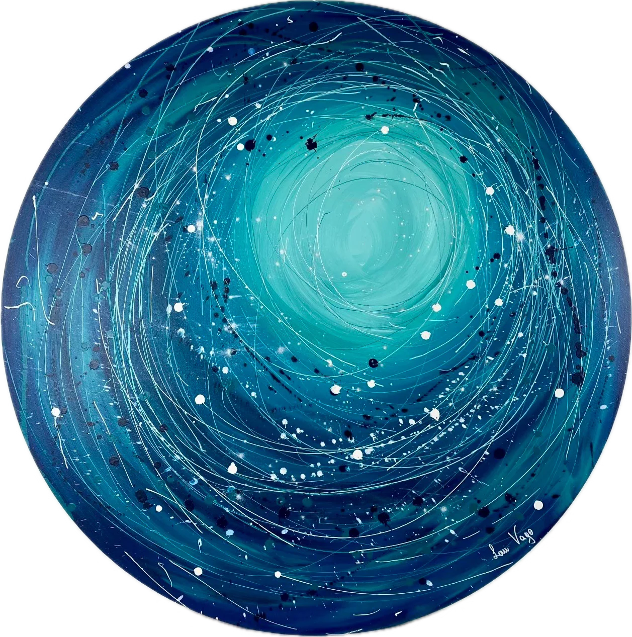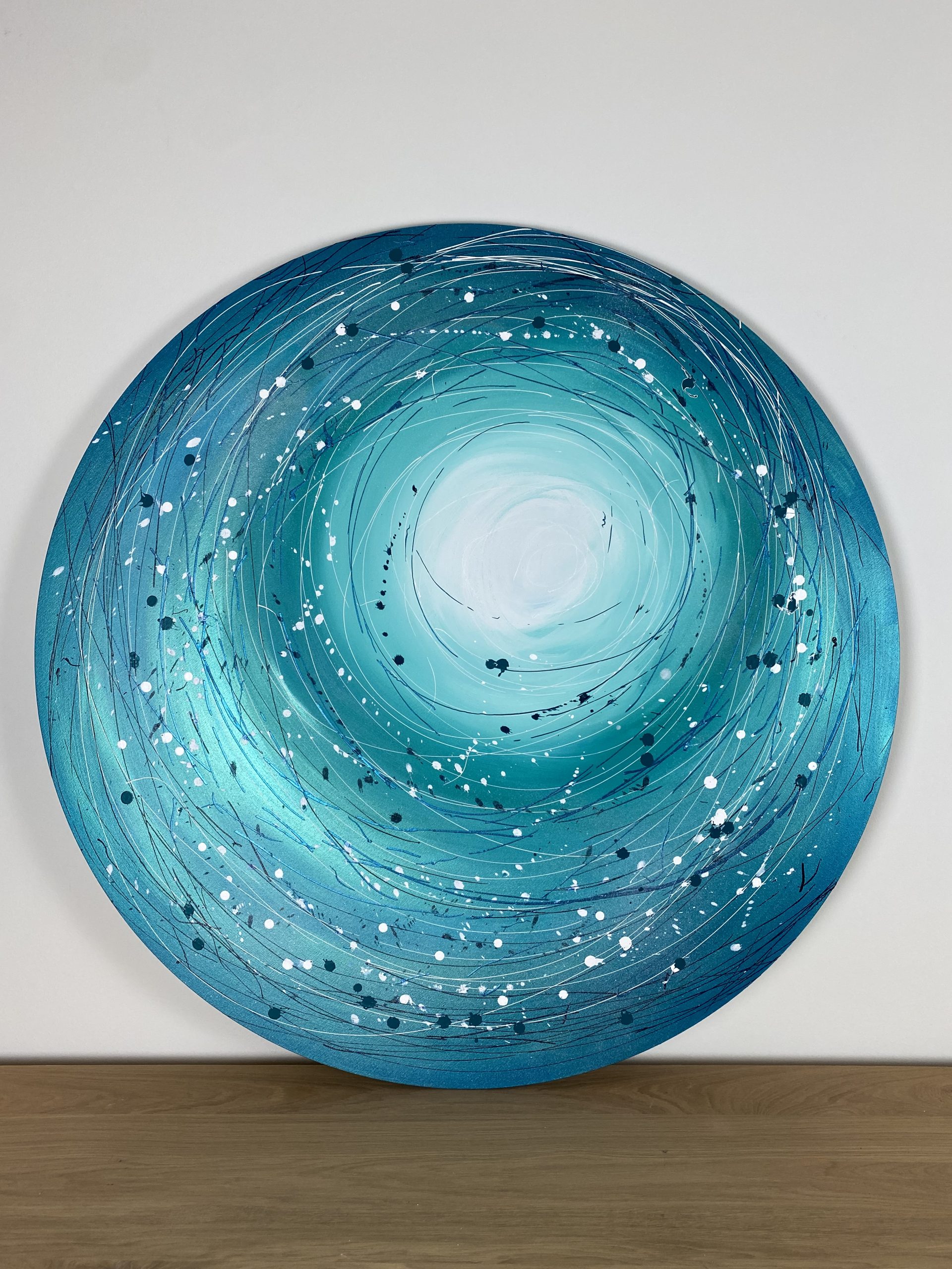 Il s’inscrit au cœur de cercles concentriques, façonnés par la projection de peinture, d’encre et de pigments sur la toile. Ces formes en mouvement tracent un parcours à la fois coloré et chaotique, une métaphore de nos trajectoires intimes, sinueuses et imprévisibles.